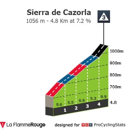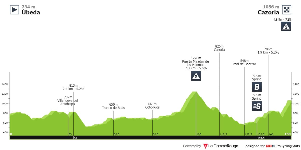 Os primeiros cem quilómetros serão relativamente pacíficos com a primeira dificuldade a aparecer já depois do meio da etapa. Puerto Mirador de las Palomas é uma segunda categoria com cerca de sete quilómetros a 5.6%, seguida de uma descida e depois o pelotão irá começar a subir ligeiramente até se deparar com a chegada a Sierra de Cazorla, mais especificamente com uma subida de terceira categoria à La Vuelta.