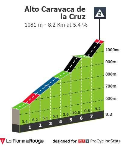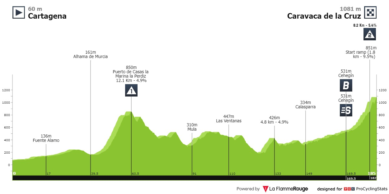 Etapa com chegada em alto mas uma chegada que não é muito dura. Na metade inicial há uma primeira categoria, o Puerto de Casas la Marina la Perdiz (que raio de nome), com 12 quilómetros a cerca de 5%, e depois algum sobe desce até à subida final.