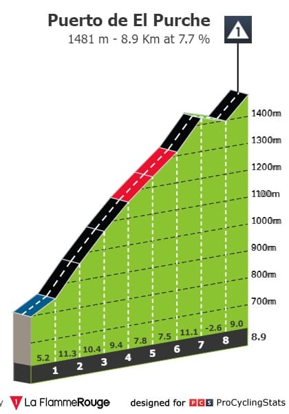 Em Granada, a primeira é o Puerto de El Purche (8.9km - 7%) e não se deixem enganar pela pendente média, porque cerca 5 quilómetros serão entre 9 e mais de 11% de inclinação.