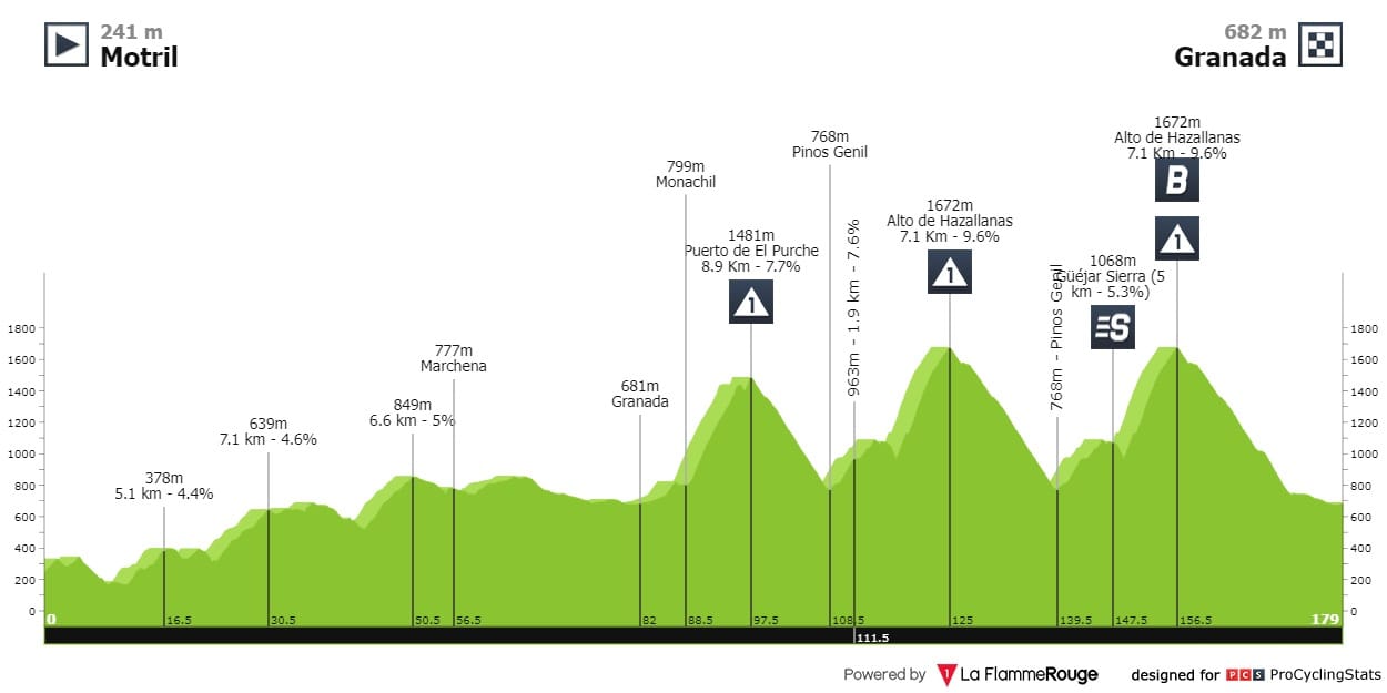 Primeiro uma subida não categorizada, mas depois terão o Alto de Hazallanas (7.1km-9.6%), com uma pendente máxima de 13.4%, sendo que os dois quilómetros finais não chegam aos 7%. Segue-se uma descida de 15 quilómetros novamente até Pinos Genil, para voltarem a subir mais uma vez até ao Alto de Hazallanas, desta vez com bonificações no topo.