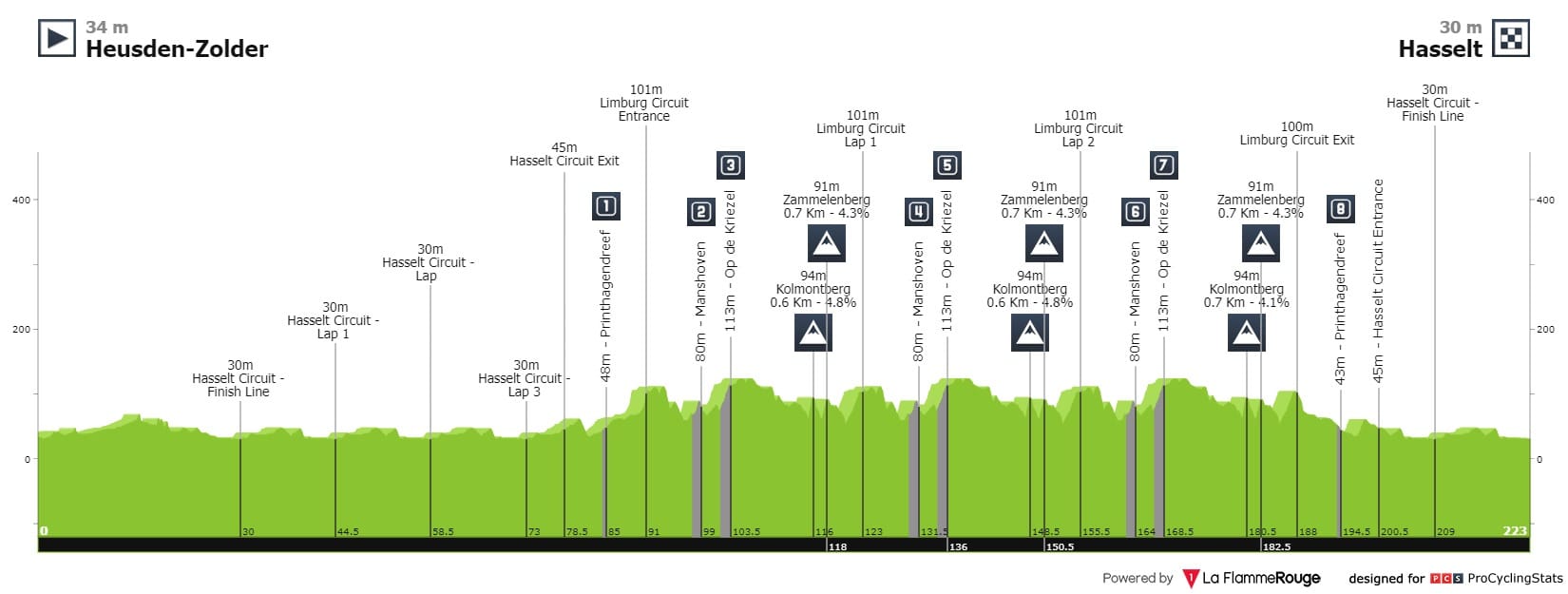 O perfil da prova será constituído por dois circuitos. Os ciclistas logo ao início passarão pela meta em Hasselt e depois darão três voltas ao circuito dentro dessa mesma cidade.