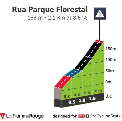 Cem quilómetros iniciais sem dificuldades servirão para apreciar as vistas e aquecer as pernas para a montanha russa que se segue. A entrada no duro circuito final, que será ultrapassado por três vezes, marcará o inicio da corrida a sério e será a oitenta quilómetros da meta que pela primeira vez os ciclistas terão pela frente a subida à Rua Parque Florestal (ótimo nome de subida). 2.1km a 8.6% já impressionam, o último quilómetro ser a mais de 10% promete muito sofrimento para os ciclistas. E muito espetáculo para nós.