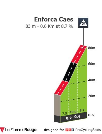 A segunda subida do circuito é também uma pequena parede, que se fará em pouquíssimo tempo mas representará a derradeira oportunidade para se fazerem diferenças. A última passagem por Enforca Cães (sem comentários) dá-se a menos de sete quilómetros da meta e a ela apenas se segue uma descida e uma rápida aproximação à meta.