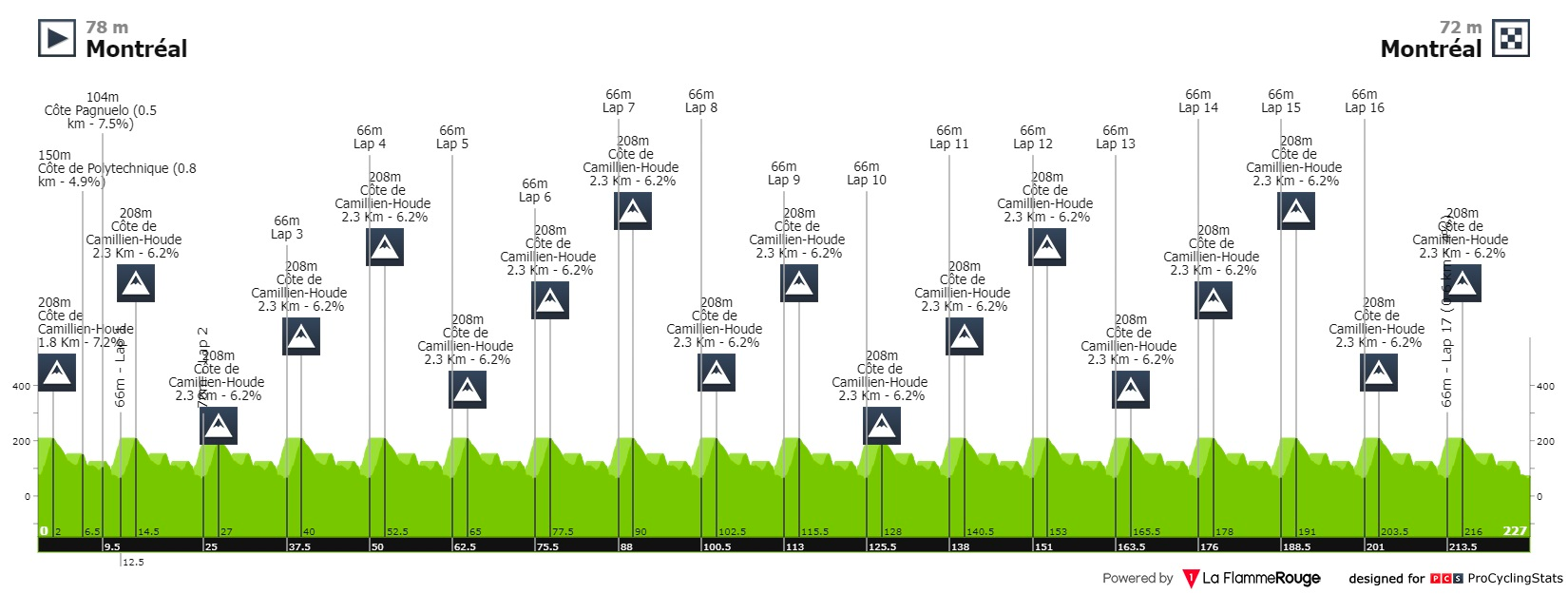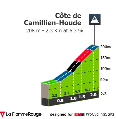 O circuito apresenta apenas uma subida, de 2.3 quilómetros a 6.3% com rampas a quase 10%. Será nestes momentos que os chamados puncheurs terão de fazer a diferença em relação aos homens mais rápidos.