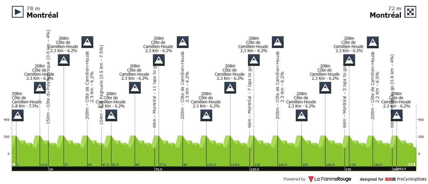 São quase 20 voltas ao Parc du Mont-Royal, com passagens pelo Côte de Camillien-Houde (2.3km @ 6.2%) — a última ascensão é a cerca de 10 quilómetros da meta. As duas lombas subsequentes também são bastantes explosivas, propícias a ataques.