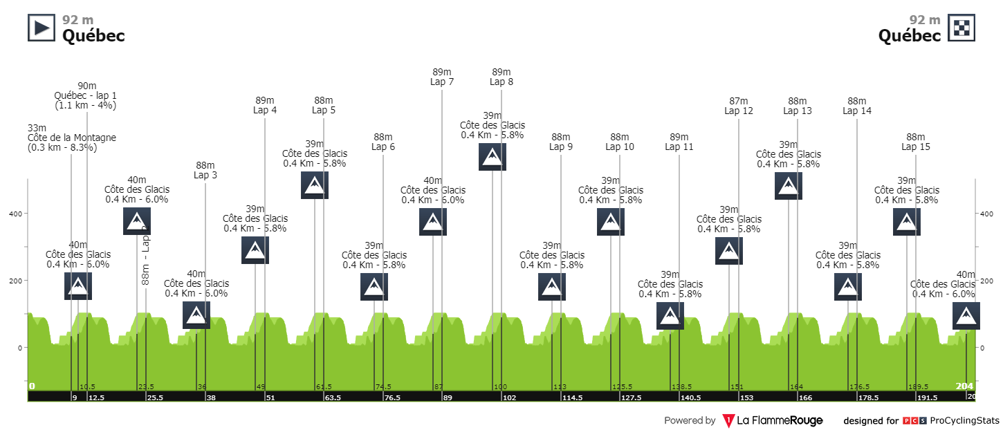 São mais de 200 quilómetros em circuito. O pelotão irá percorrer 16 voltas em torno da velha capital, que termina em subida, pela colina em Old Quebec. Etapa com muito relevo e com subidas curtas, mas íngremes. Vai ser durinho.