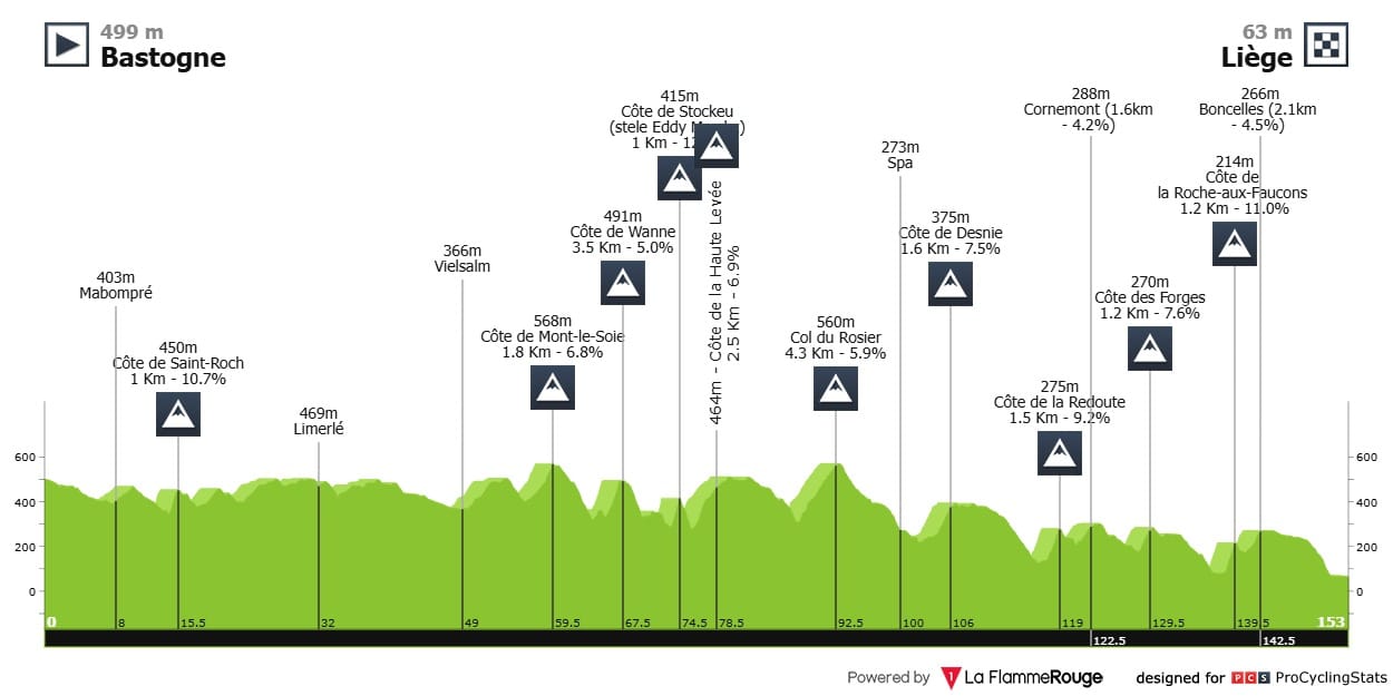 É um sobe e desce constante, passam no Côte de Stockeu (local onde existe uma estátua do Merckx, ficam com esta informação) mas a parte mais importante da corrida é no último terço da prova, onde as ciclistas vão encontrar o Côte de la Redoute (1.5 km a 9.2%), la Roche-aux-Faucons (1.2 km a 11%) e a Boncelles (2.1 km a 4.5%)