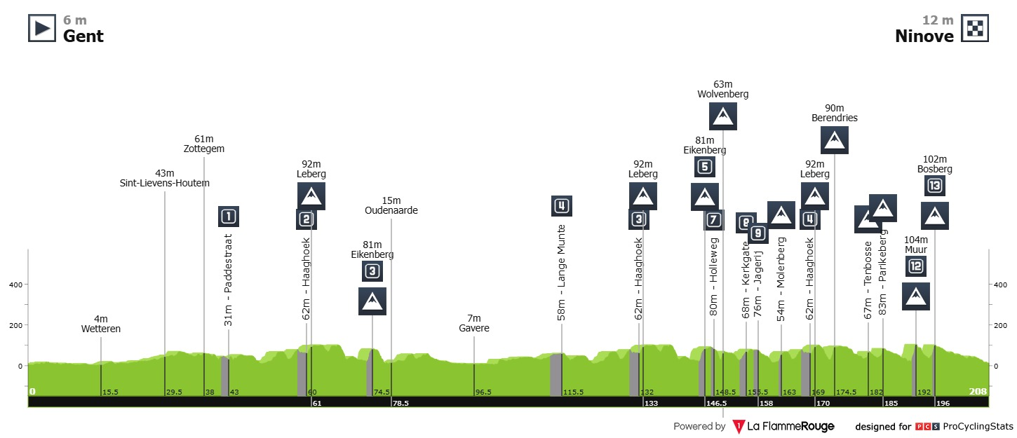Com o segundo bloco de setores a surgir e a organização a acrescentar o Tenbosse (400m @ 6%) e o Parikeberg (700m @ 5.3%) antes do Muur a corrida vai endurecer. Muur esse que dispensa apresentações, é um quilómetro com percentagens a rodar os vinte no final do topo. E antes de uma descida com ligeira inclinação até à meta no centro da cidade de Ninove temos o Bosberg (0.9 @ 6.4%) que poderá ajudar a manter as diferenças que possam ser feitas no Muur.