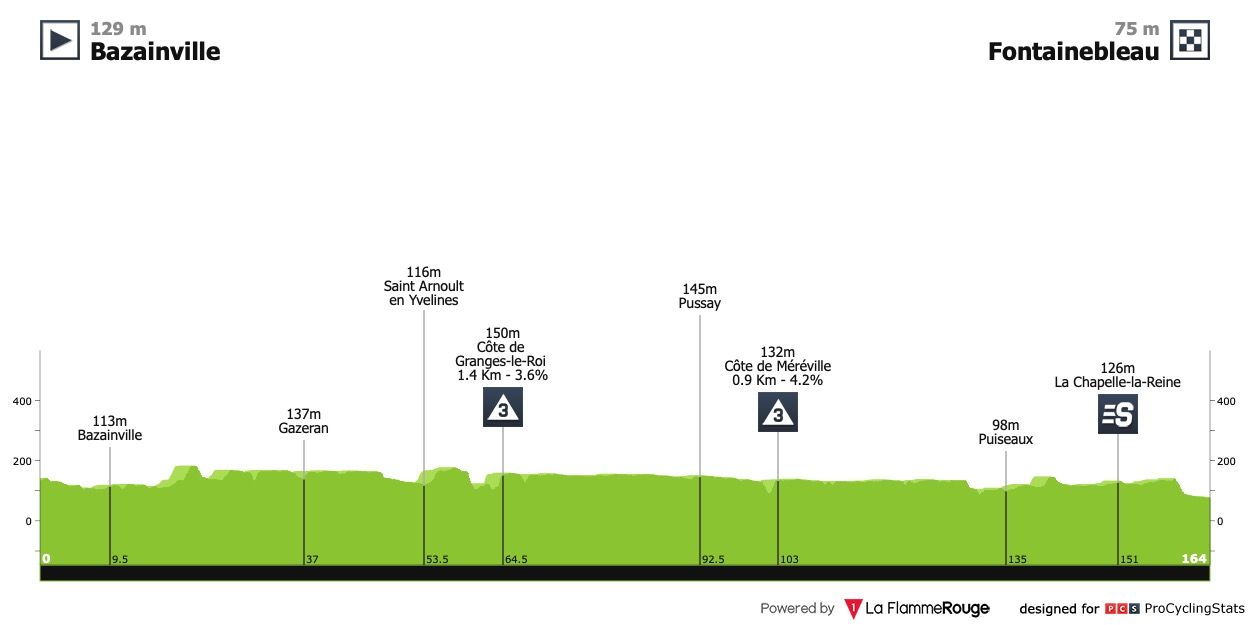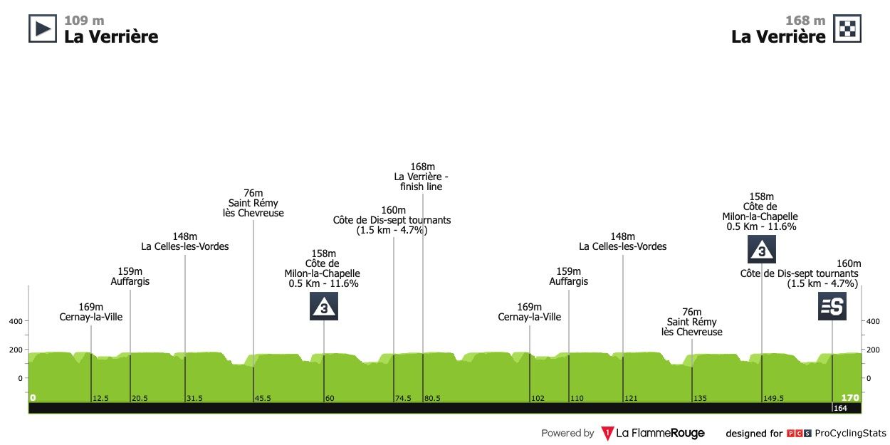Etapa 1 — A primeira etapa consiste num percurso de duas voltas, sem grandes dificuldades, num circuito nos arredores de Paris. Há um murito a 20km da meta (Côte de Milon-la-Chapelle: 500m @ 10.5%) mas não deverá evitar uma chegada ao sprint, pelo menos para a maioria dos sprinters.