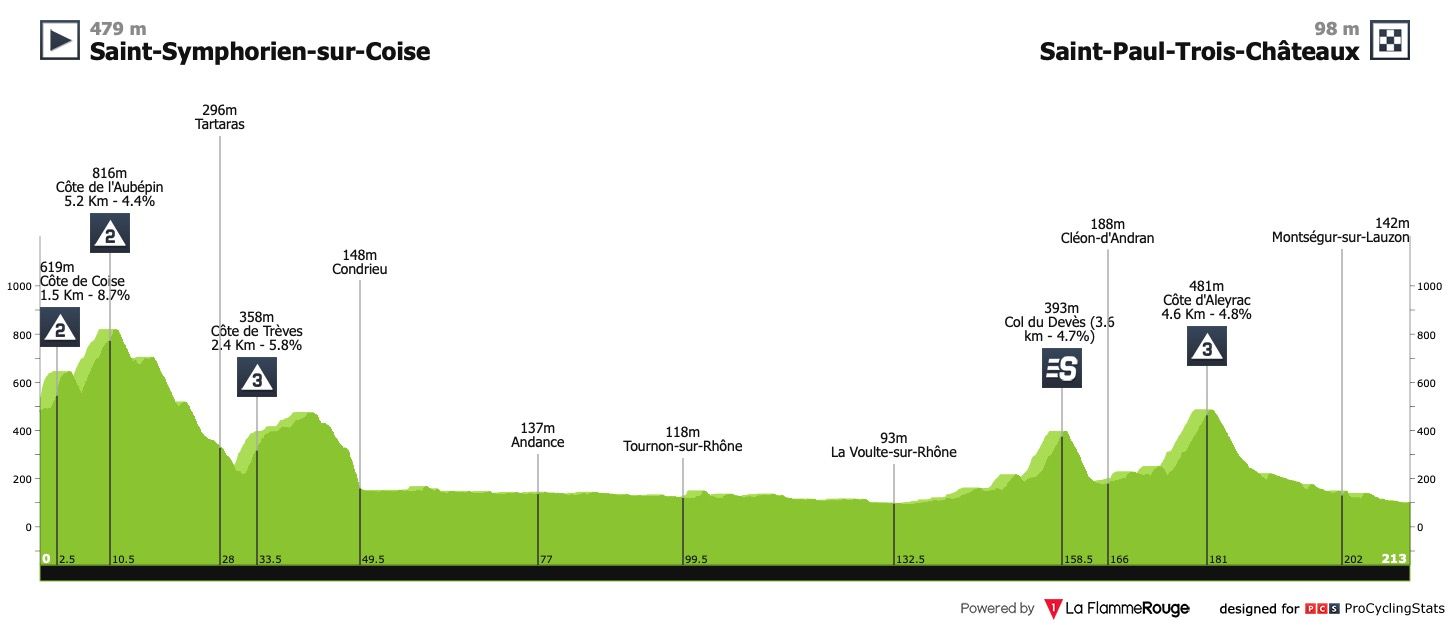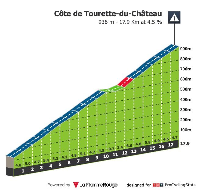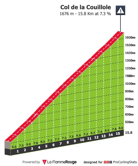 Etapa 7 — Na primeira metade da etapa há a subida à Côte de Tourette-du-Château: são 18 quilómetros a 4.5% que já vão servir para moer as pernas e perceber quem está em dia não. A 15 quilómetros da meta surge, finalmente, uma montanha a sério: a Col de la Couillole, que tem 7.3% de pendente média. Não se espera outra coisa senão mais um duelo Pogačar vs Vingegaard.