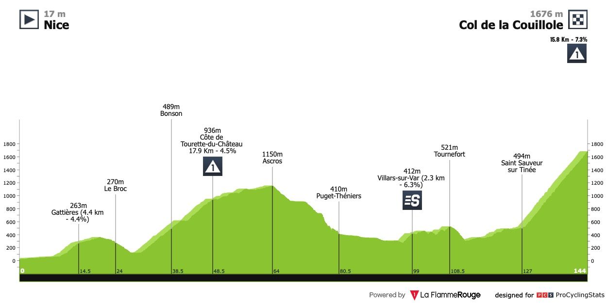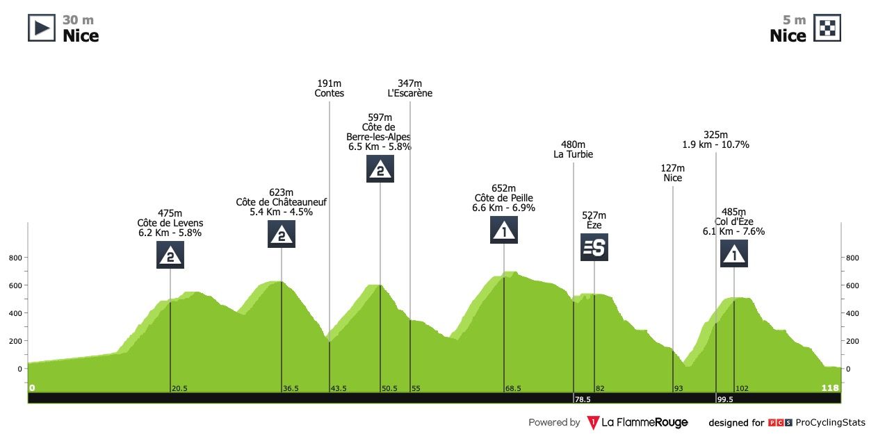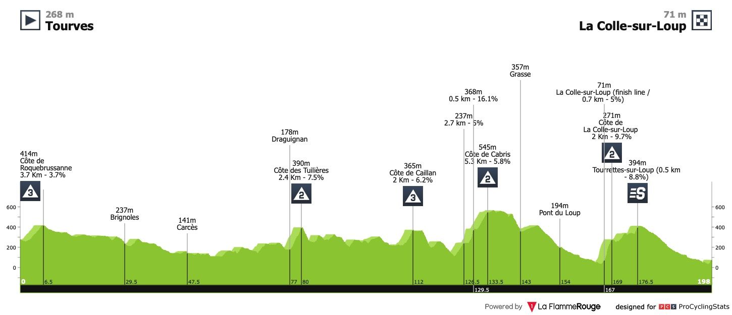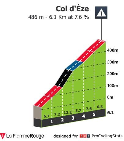 Etapa 6 — Fuga ou sprint reduzido? Etapa de sobe e desce com algumas subidas curtas, sendo a última delas, a mais dura, a cerca de 30 quilómetros da meta (Côte de La Colle-sur-Loup: 2km @ 9.9%). Os últimos 500 metros da etapa têm uma pendente média a rondar os 7%. Não vejo ninguem capaz de bater Magnus Cort aqui.