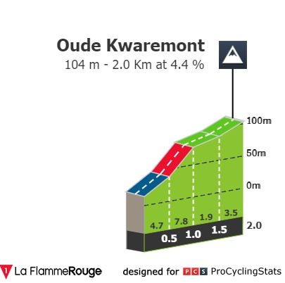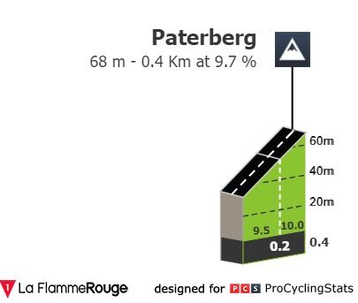 Se a isto juntarmos a primeira passagem pelo Paterberg três quilómetros e meio depois… temos o caldo entornado. Esse deve ser o troço onde os principais candidatos se vão demarcar da concorrência mais numerosa. O Paterberg é também a última dificuldade da Ronde antes da chegada a Oudenaarde, sensivelmente a 14 quilómetros da meta, e propõe aos ciclistas 400 metros a 9.7% de pendente média, em empedrado, e com uma pendente máxima superior a 20%. Socorro.