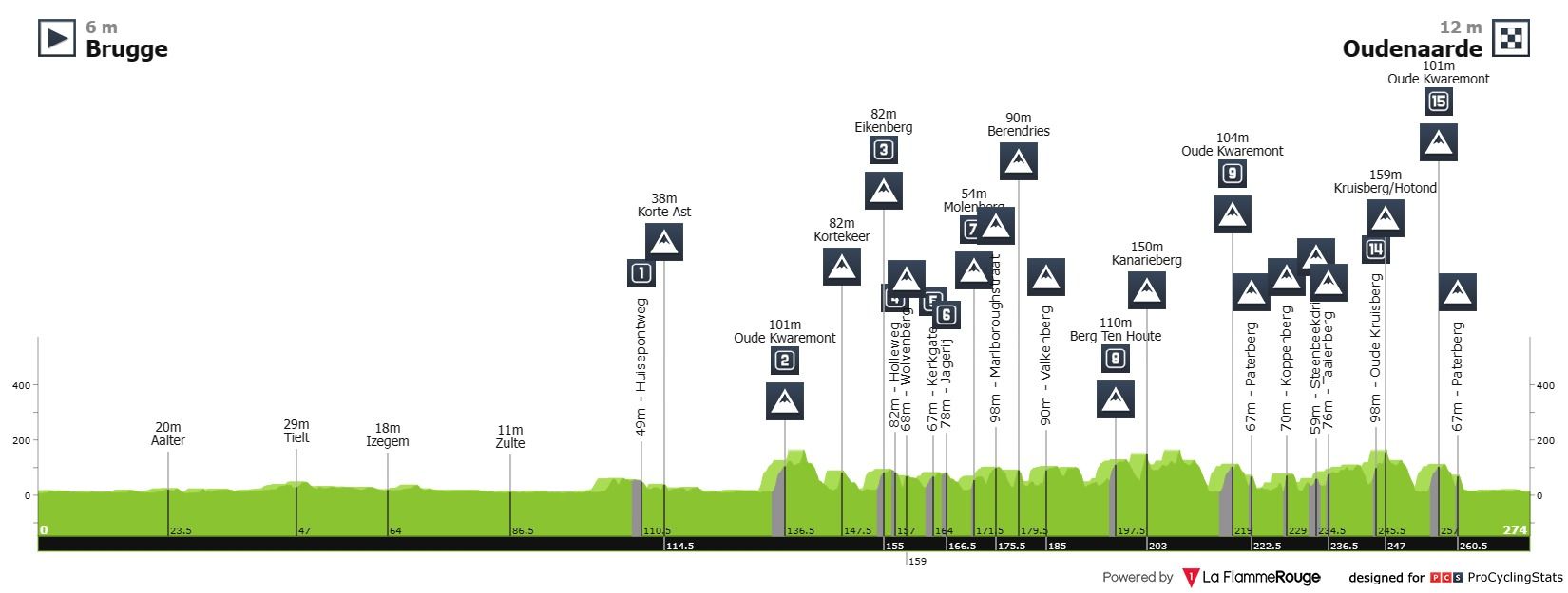 É o mesmo de sempre e nem por isso fica mais leve com o passar dos anos. Quase 274 quilómetros de dureza extrema: quer seja pelos 15 sectores de pavé, quer seja pelas múltiplas pequenas subidas — que na Flandres se conhecem por bergs — por onde os ciclistas vão ter de passar. Como sempre, a corrida deve começar a decidir-se a cerca de 70 quilómetros para a meta, nomeadamente com a passagem do Kanarieberg — um quilómetro a 8%, sem empedrado, mas que deve servir para os primeiros testes e para o afinar do posicionamento.