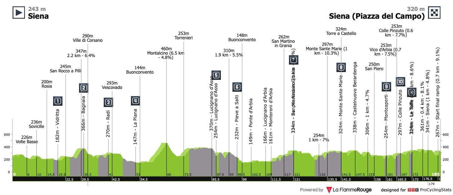 Sangue. Espera-se muito sangue. É uma daquelas corridas que sabemos que partem cedo, que geram inúmeros furos e problemas mecânicas e que, por isso mesmo, pela paisagem e por tudo o resto, é imperdível. A meio da corrida, já muito gente vai estar arredada da luta e a selecção para os vencedores vai começar a ser feita bastante cedo. Diria que na pior das hipóteses, por volta do sector 7 ou 8, os ataques vão começar a ser mais insistentes, ataques que na Strade Bianche muitas vezes são meros aumentos de ritmo. A maior parte das vezes, o que acontece é um grupo muito curto chegar junto, ou pelo menos próximos, a Siena. Se até aí não se conseguirem distanciar, vão ser as inclinações da entrada em Siena (nomeadamente na Via de Santa Caterina) a decidir o vencedor — recorde-se o ataque impressionante de Mathieu Van der Poel em 2021, deixando Alaphilippe pregado à estrada.