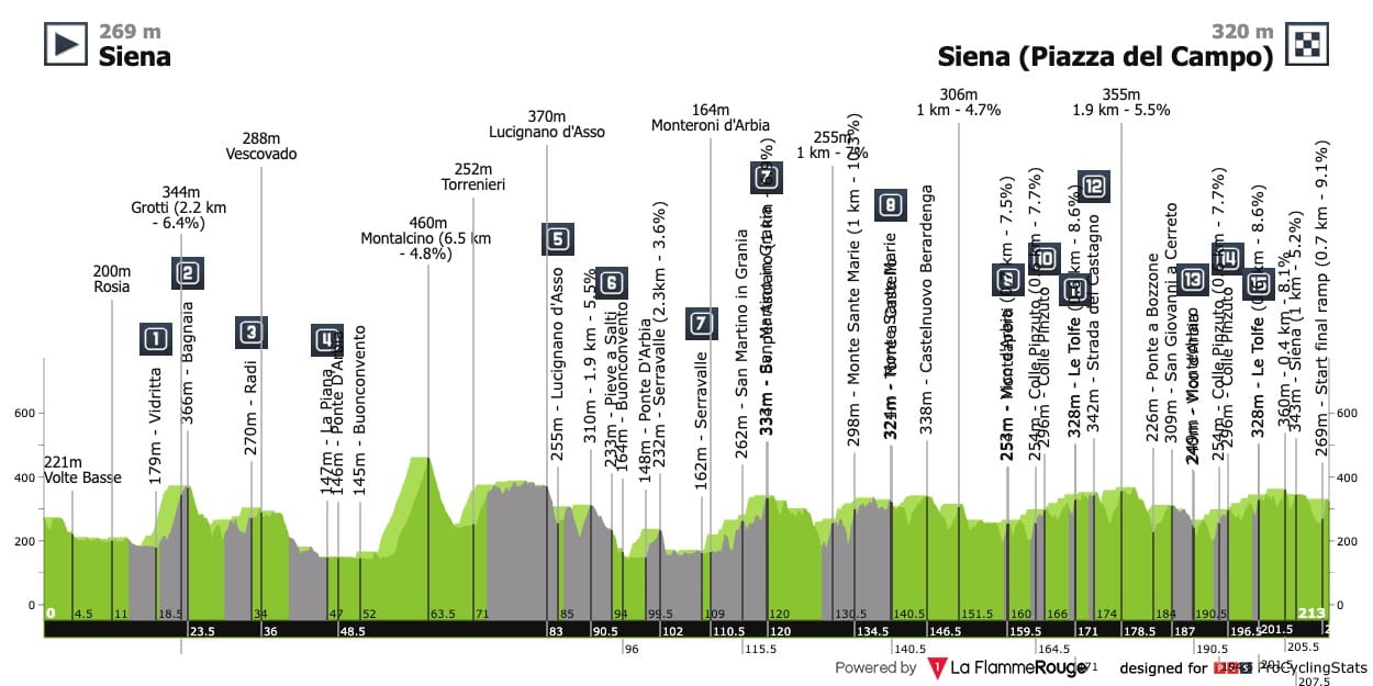 Este ano a corrida terá uma extensão de duzentos e treze quilómetros, dos quais mais de oitenta serão em gravel, que estarão distribuídos pelos dezasseis setores existentes. De ano para ano a organização tem vindo a endurecer ligeiramente a corrida, numa tentativa de misturar as montanhas com os setores de gravel de forma a garantir a versatilidade do pelotão World Tour.