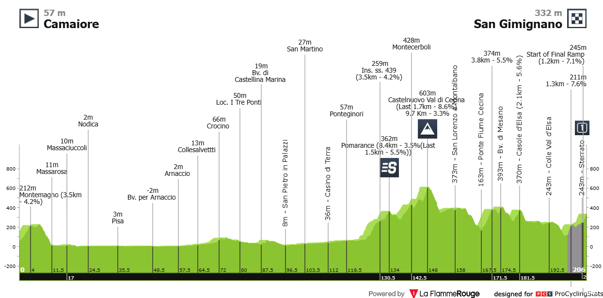 Etapa 6 — Aqui é que a porca (e por porca leia-se Van der Poel/Ganna/Van Aert) pode torcer o seu belo traseiro. É verdade que não é bem alta montanha e que a subida mais longa a Sassotetto (13km a 7.3% - maior dificuldade de toda a semana) se encontra muito longe da meta, mas se quiserem descartar estes classicómanos aqui será o local perfeito. Caso queiram adiar o problema, a tripla passagem pelo paredón de Camerino deve resolver a questão. O último quilómetro a 12% deverá coroar o novo dono do Tridente que serve de troféu a esta prova. Até choram.