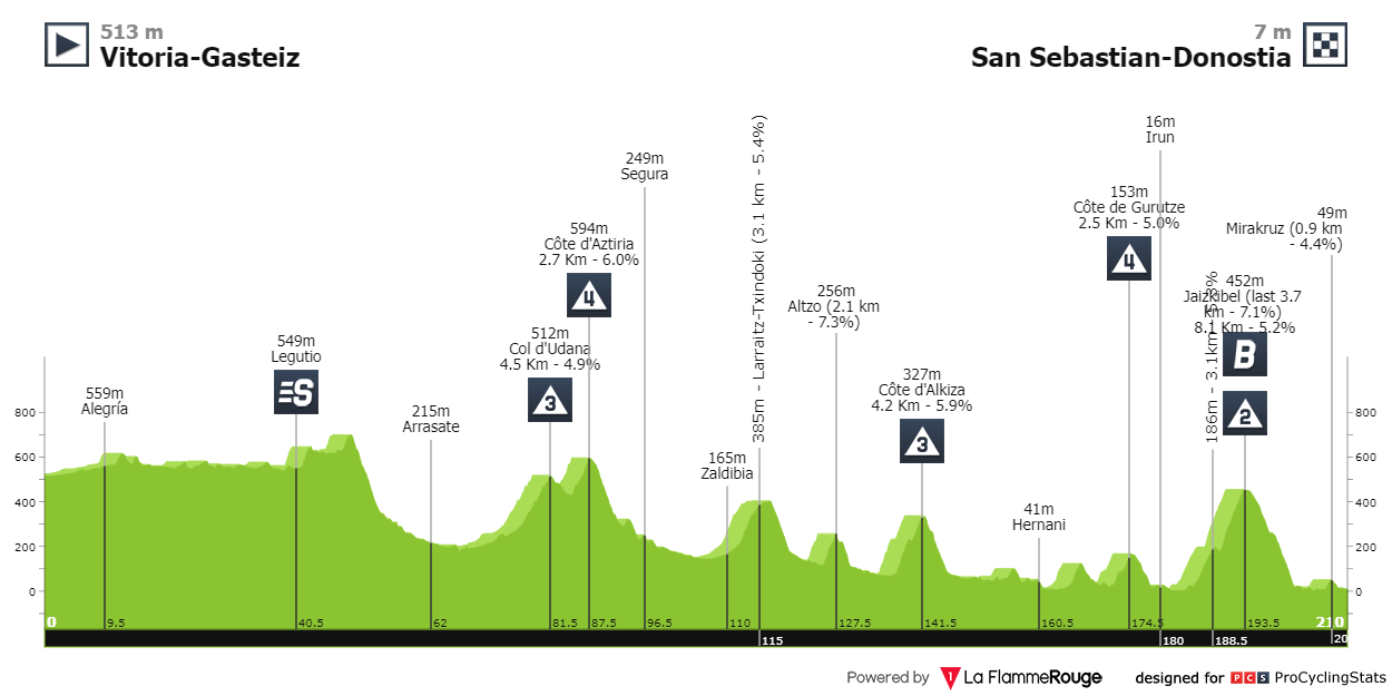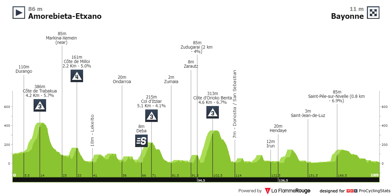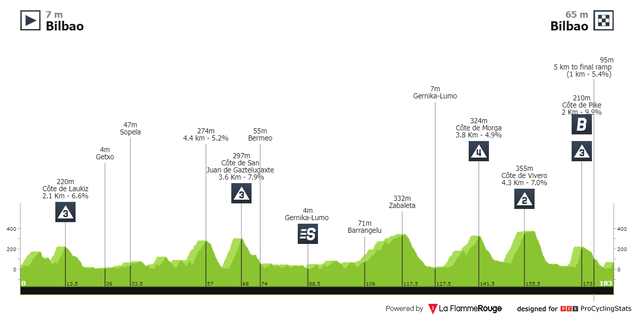 Etapa 1 — Percurso que começa e termina na cidade de Bilbau. Perfil idêntico ao de uma clássica, mas com a extrema dureza que existe a 10kms do final pode ser logo um primeiro dia para a geral e se algum dos outros monstros conseguir seguir não será uma grande surpresa.