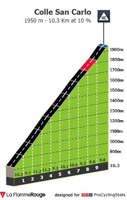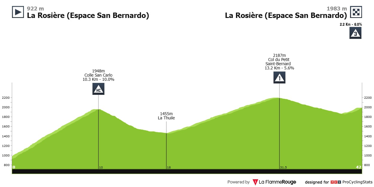 Começa a subir o Colle San Carlo (10,3km a 10%) que a imagem fala por si, tem uma ligeira descida e sobem novamente o Col du Petit Saint Bernard (13,2km a 5.6%). Depois parece que acaba em falso plano, mas é só parecer: são 2,2km a 6%.