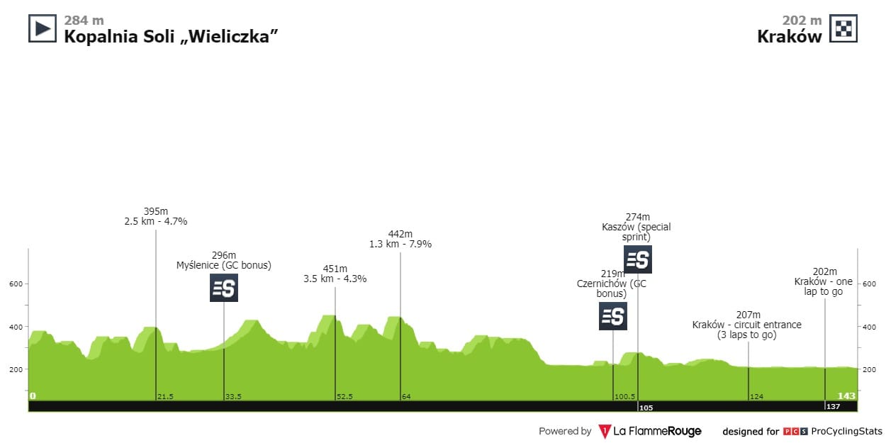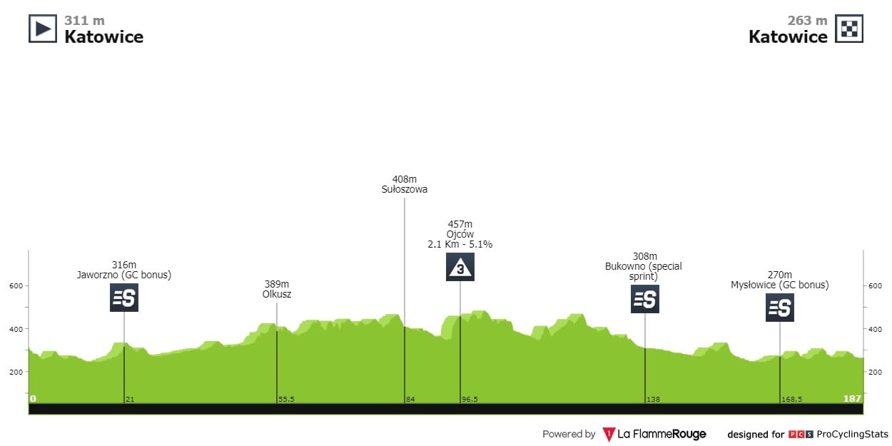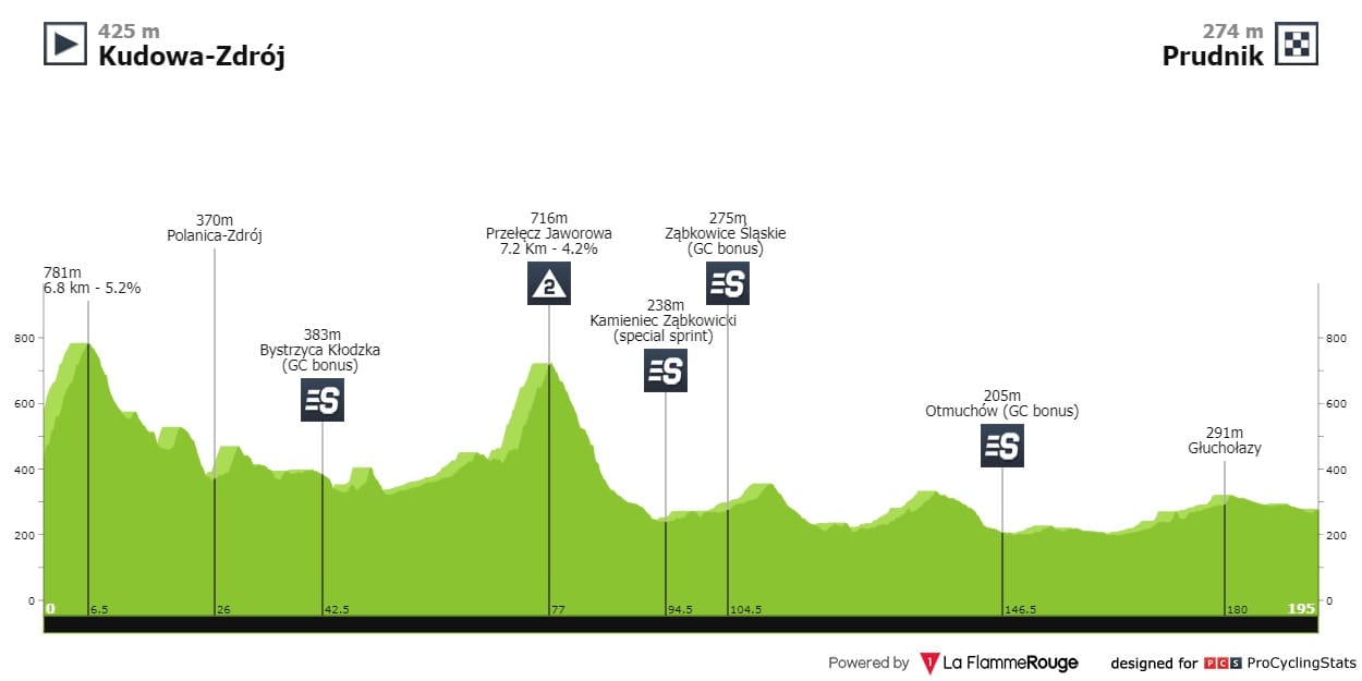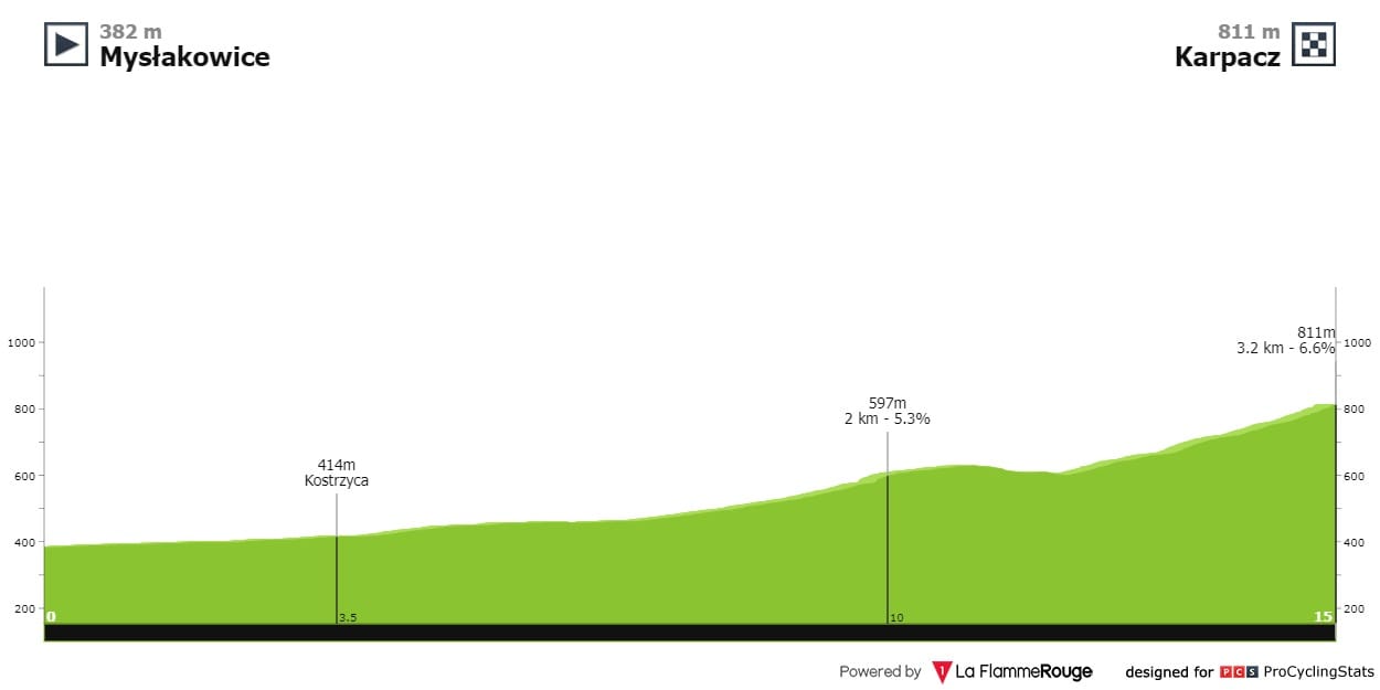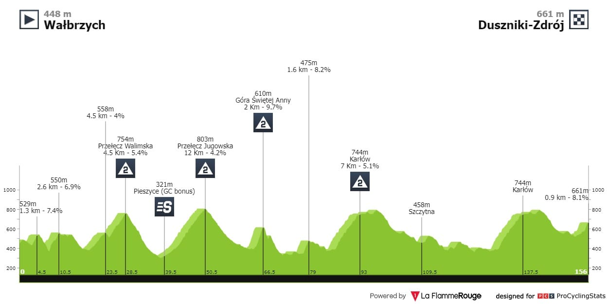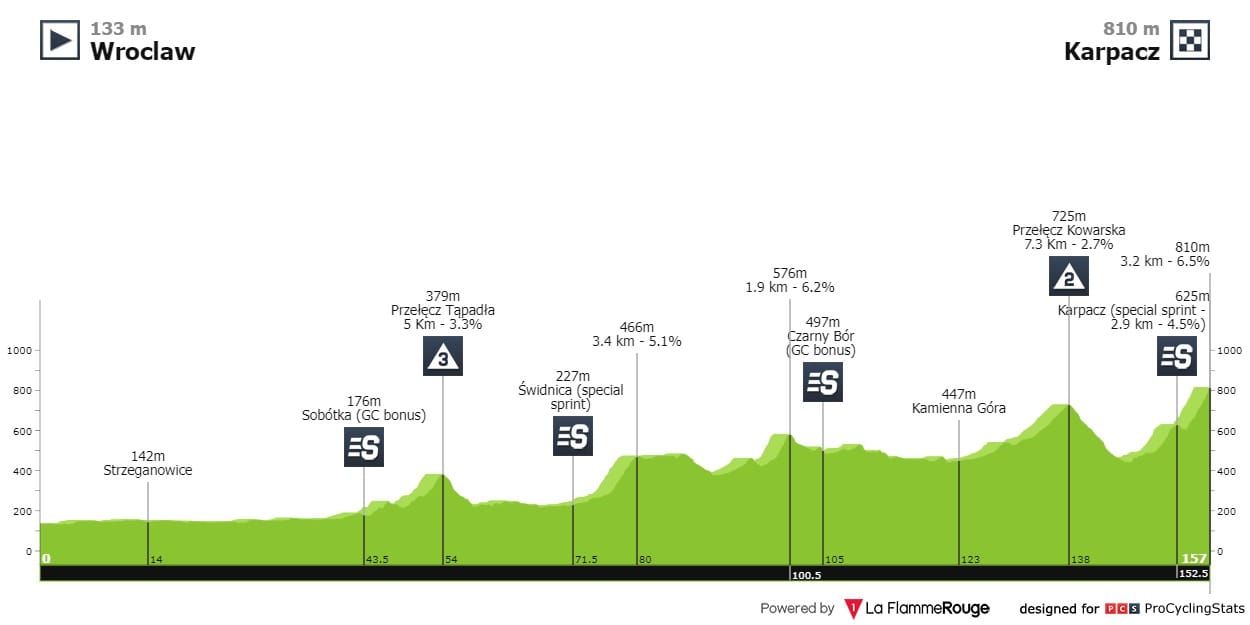 Etapa 1 — Dia para a geral com um final que pode começar a definir quem fica e quem vai. A chegada a Karpacz começa com 2.9 quilómetros a 4.5% e termina com 3.2km a 6.5%.