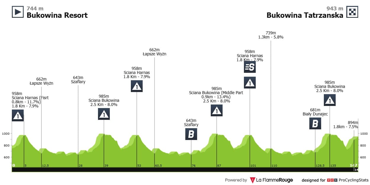 Etapa 6 — Eis a já clássica etapa em torno de Bukowina na Volta a Polónia. Partida do resort que tantas vezes se cruza com a história desta corrida, chegada também lá muito perto, na subida de quase dois quilómetros a mais de 7% de pendente média. Antes disso, a Sciana Bukowina vai meter toda a gente em sentido: 2,5kms a 8%. E como podemos ver é uma etapa em circuito, que passa estas várias montanhas por várias vezes. Vai ser full gas.