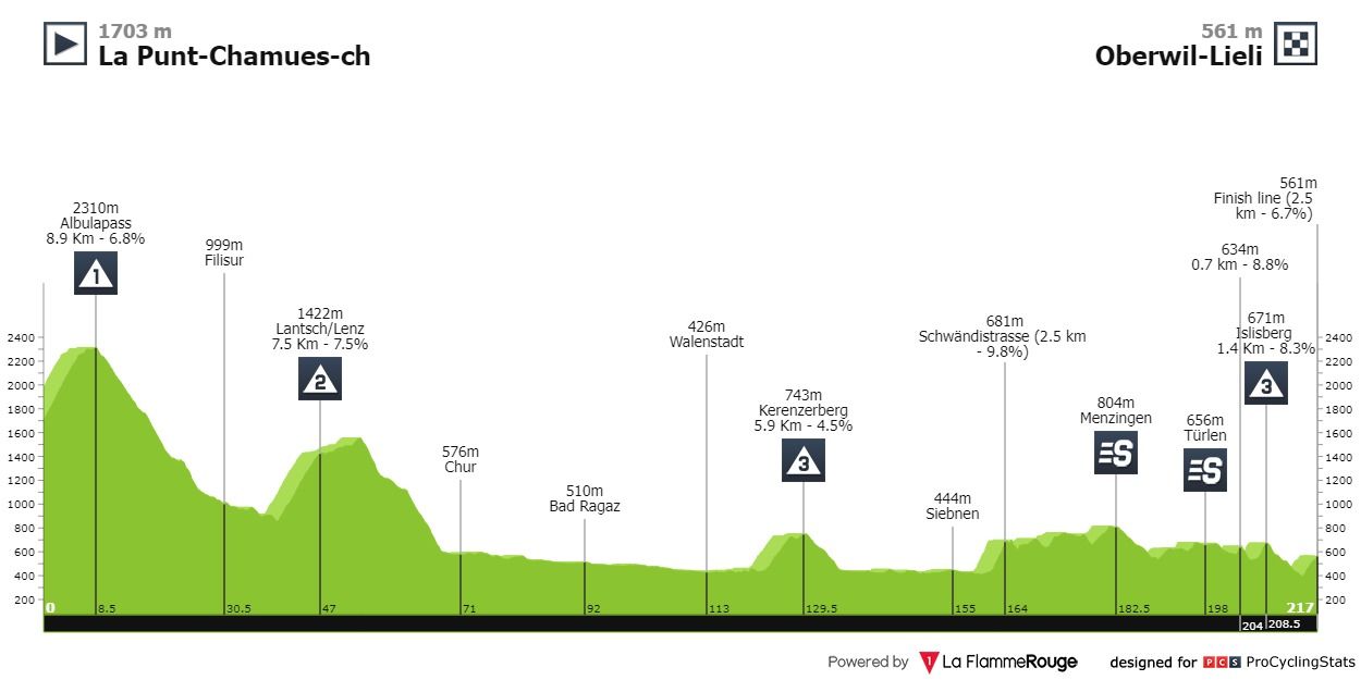 Etapa 6 — A etapa 6 inicia onde terminou a anterior e começa logo com parte da mesma última súbida da etapa 5, a primeira categoria Albulapass (8.9km — 6.8%). Depois o percurso tende em aligeirar a sua dureza com o tempo. Ao entrarmos nos últimos 50 quilómetros, os atletas que passaram por uma segunda e terceira categoria, vão encontrar um percurso montanhoso até ao final com pequenas subidas e descidas, e ainda a última contagem de montanha Islisberg (1.4km — 8.3%). O final é a subir, serão 2.5 quilómetros a 6.7%.