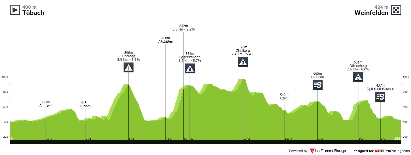 Etapa 7 — Se ainda não se cansaram de subidas com categoria, a etapa 7 promete mais espetáculo neste capítulo. A primeira contagem será logo uma primeira categoria, Oberegg (8.9km — 5.3%) e depois seguem-se Eggerstanden (6.2km — 5.7%), Glattberg (2.4km — 5.4%) e já perto do final Otteneberg (2.6km — 8.0%), onde continuam ligeiramente em subida para depois descerem até Weinfelden.