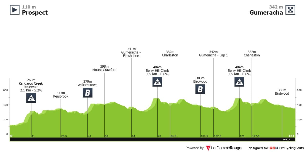 Etapa 1 — A primeira etapa terá início em Prospect e termina em Gumeracha num circuito de duas voltas. Longe de ser um etapa plana, a maior dificuldade será sem dúvida a dupla passagem pela Berry Hill Climb (1.5km a 6.6%), seguindo-se depois a descida até Gumeracha.