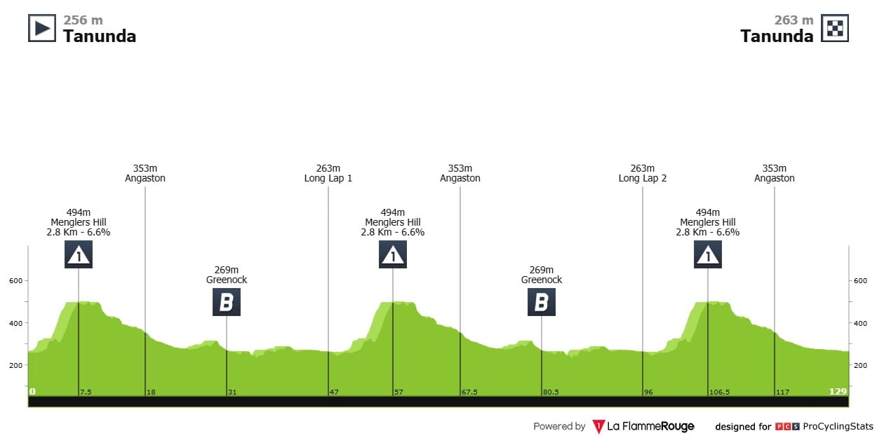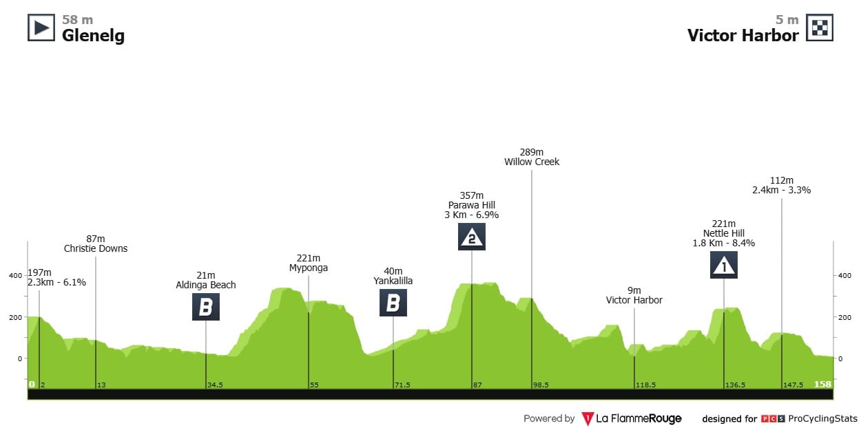 Etapa 4 — O sobe e desce continua e desta feita não será diferente do dia anterior. A partida em Glenelg começa logo a subir e será depois na segunda metade que virão as dificuldade destacando a segunda e última, o Nettle Hill (1.8km a 8.4%), que termina já dentro dos últimos trinta quilómetros.