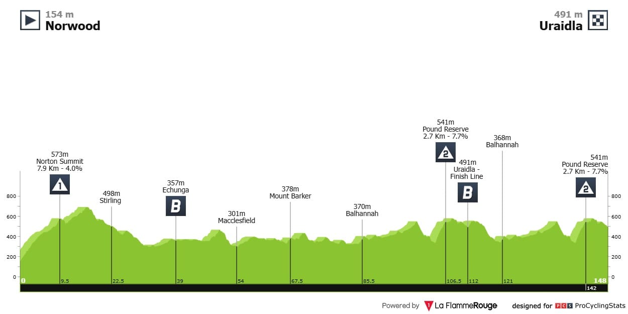 Etapa 3 — A terceira etapa terá um início duro em Norwood logo a subir até ao Norton Summit (7.9km a 4.0%) e depois aligeira até ao quilómetro 106 onde o Pound Reserve (2.7km a 7.7%) é passado pela primeira vez seguido da primeira passagem pela meta em Urailda e novamente ao quilómetro cento e quarenta e dois que irá deixar os ciclistas a aproximadamente seis quilómetros da meta.
