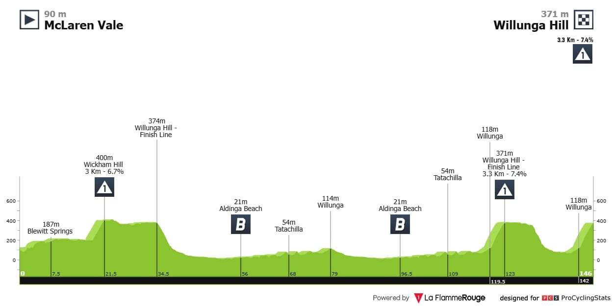 Etapa 5 — É no penúltimo dia de prova e a receita histórica repete-se e com isto quer dizer Willunga Hill (3.3km a 7.4%), a dobrar. É a etapa rainha da prova australiana e irá colocar um ponto final na classificação geral.