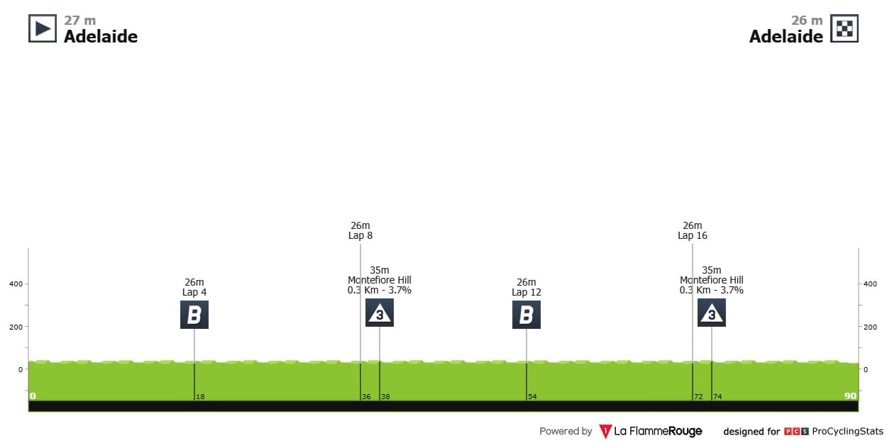 Etapa 6 — E porque nada parece ser plano na Austrália, a última etapa irá ser feita num circuito de vinte voltas em torno de Adelaide com uma "pequena lomba " de 300m a cada oito voltas, o Montefiore Hill (0.3km a 3.7%). Fora isso é praticamente uma etapa plana.