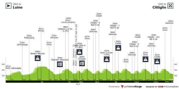 A entrada no circuito é feita a 95km do final, e dão um total de 5 voltas a um circuito de 18km, que tem como dificuldades o Casale (800mts a 7,8%) e o Orino (2,9km a 4,5%).