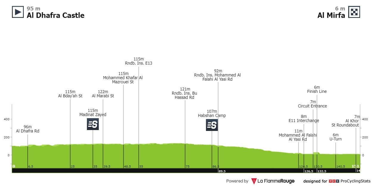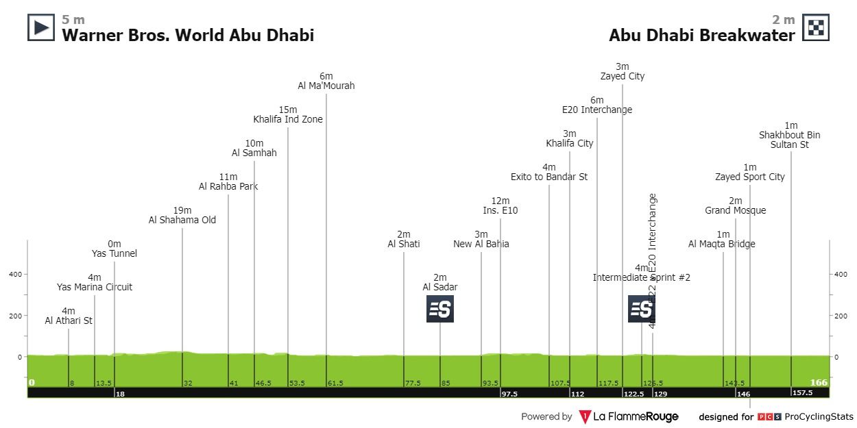 Etapa 2 — Um contrarrelógio por equipas no porto de Khalifa: curto, plano e sem grandes dificuldades técnicas.