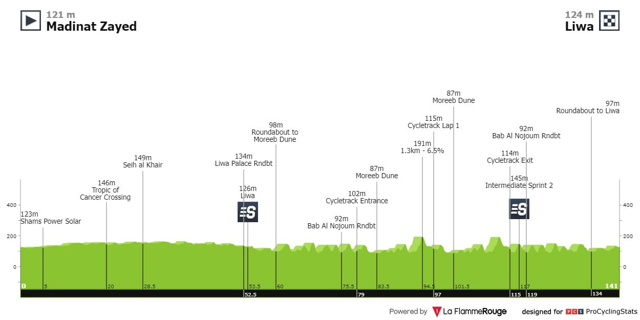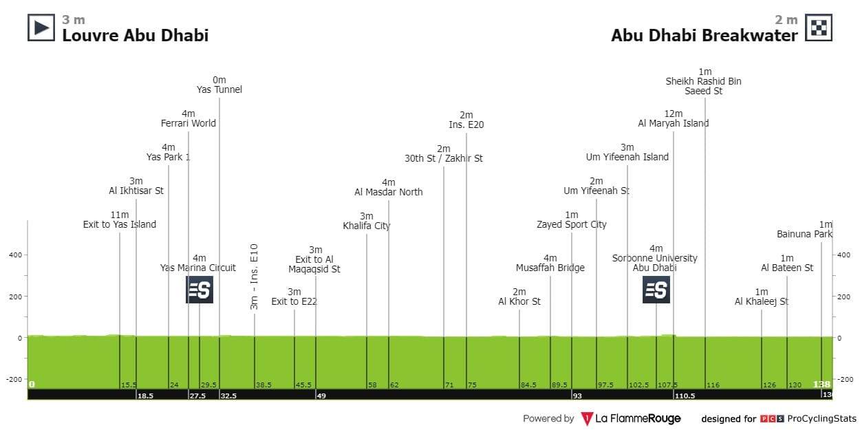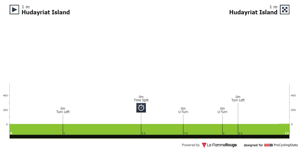 Etapa 2 (ITT) — Contrarrelógio de 12 quilómetros na ilha de Hudayriat, plano mas com algumas curvas que exigem mais técnica para serem feitas a alta velocidade.