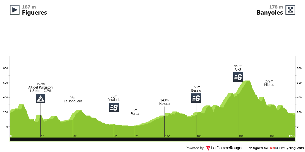 Etapa 2 — No ano passado, o pelotão partiu de Banyoles rumo a Figueres no segundo dia, este ano é exatamente o contrário. Ao longo de 167,4 quilómetros vamos ter cerca de 2000 metros de acumulado mas ainda assim espero ver os velocistas a disputar a vitória.
