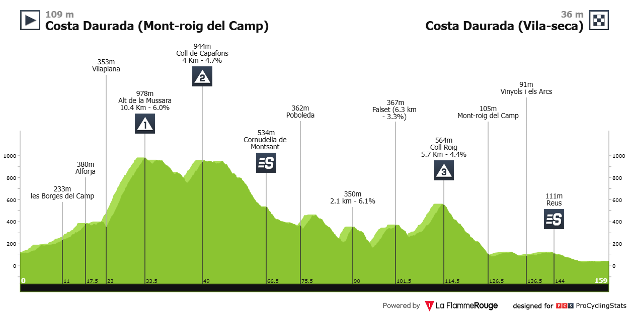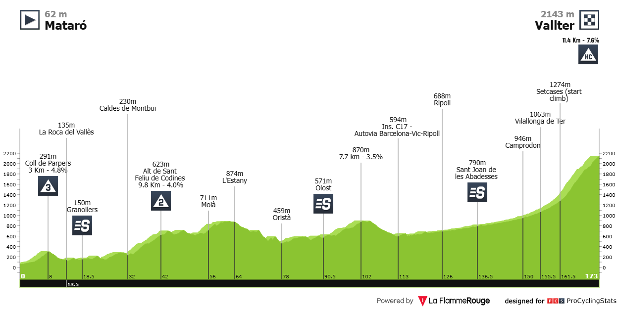 Etapa 1 — Começo já bem tradicional com a chegada a Sant Feliu de Guixols. São 600 metros a 4,2%. Um sprint punch que tem tudo para proporcionar um bom espetáculo tal como em edições anteriores.