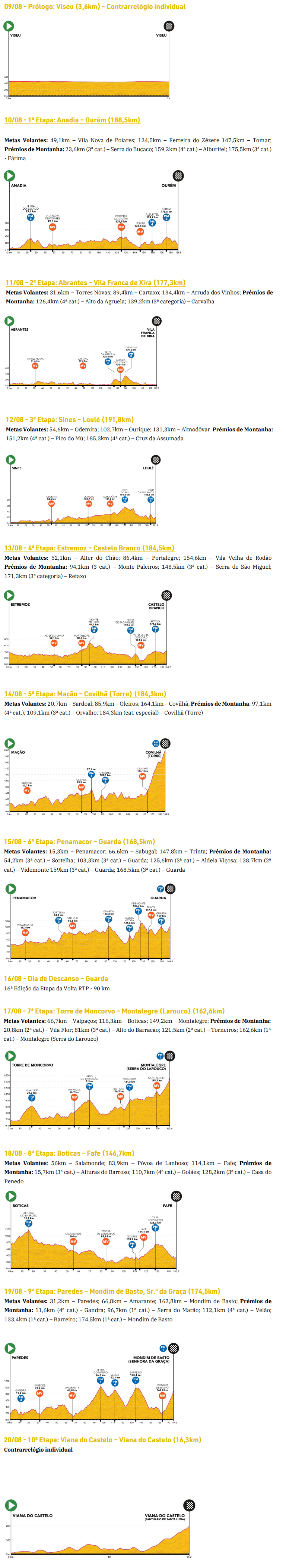Vai ao centro, vai ao sul e acaba a norte. Regressam passagens por cidades emblemáticas e o percurso, não sendo surpreendente, é equilibrado. Só faltam as ilhas, mas infelizmente a "Grandíssima" tem vivido voos curtos nos últimos anos. De 9 a 20 de agosto, a Volta vai ser discutida pelos trepadores das equipas portuguesas e talvez sorria a quem tiver pedal para uma dose extra de contrarrelógio.
