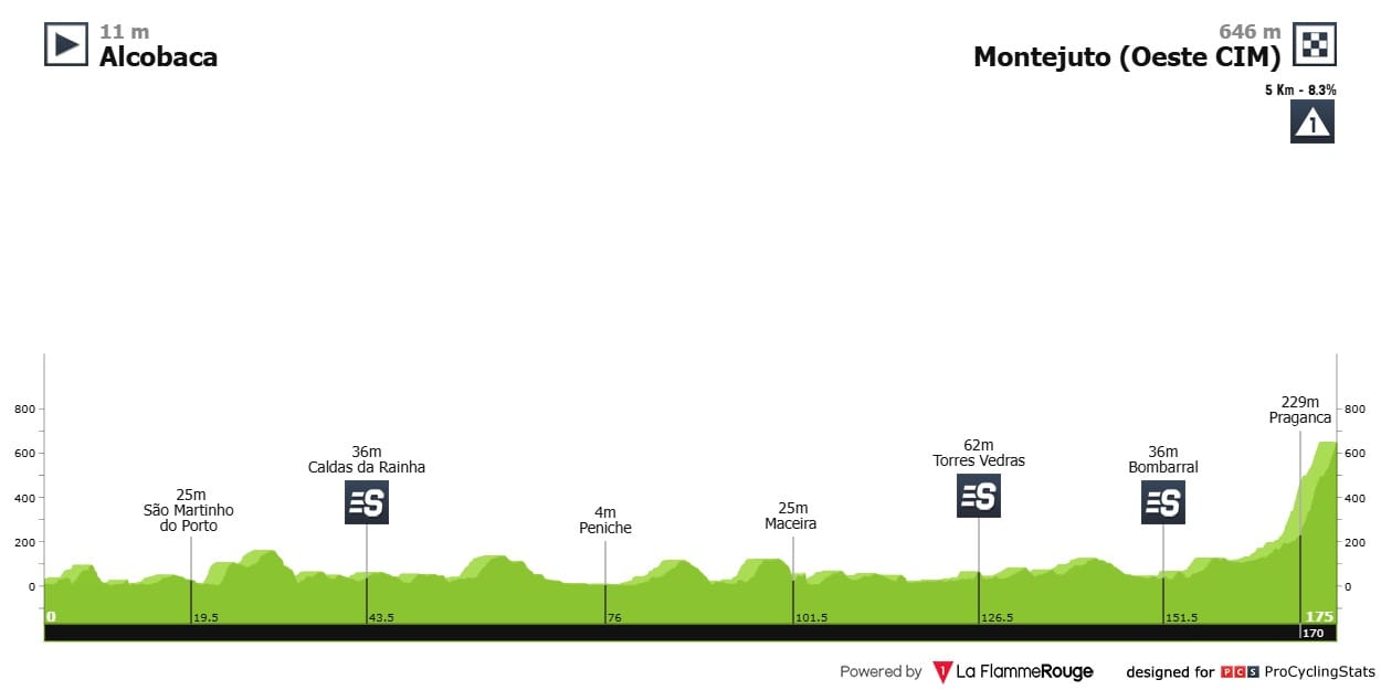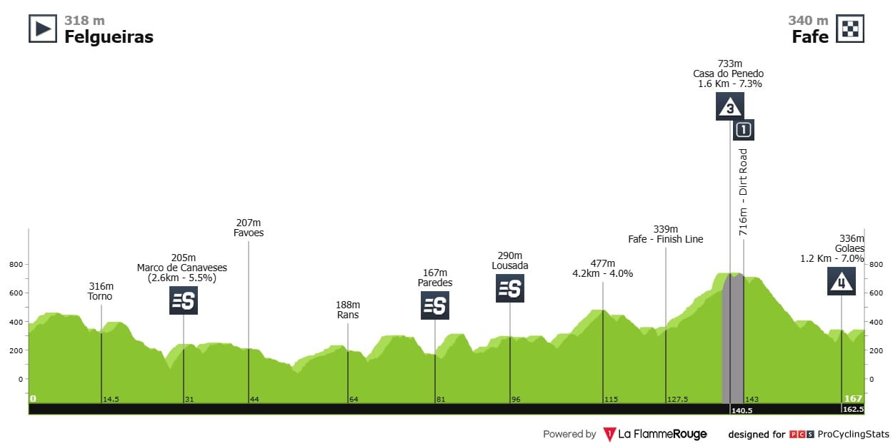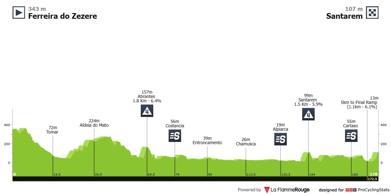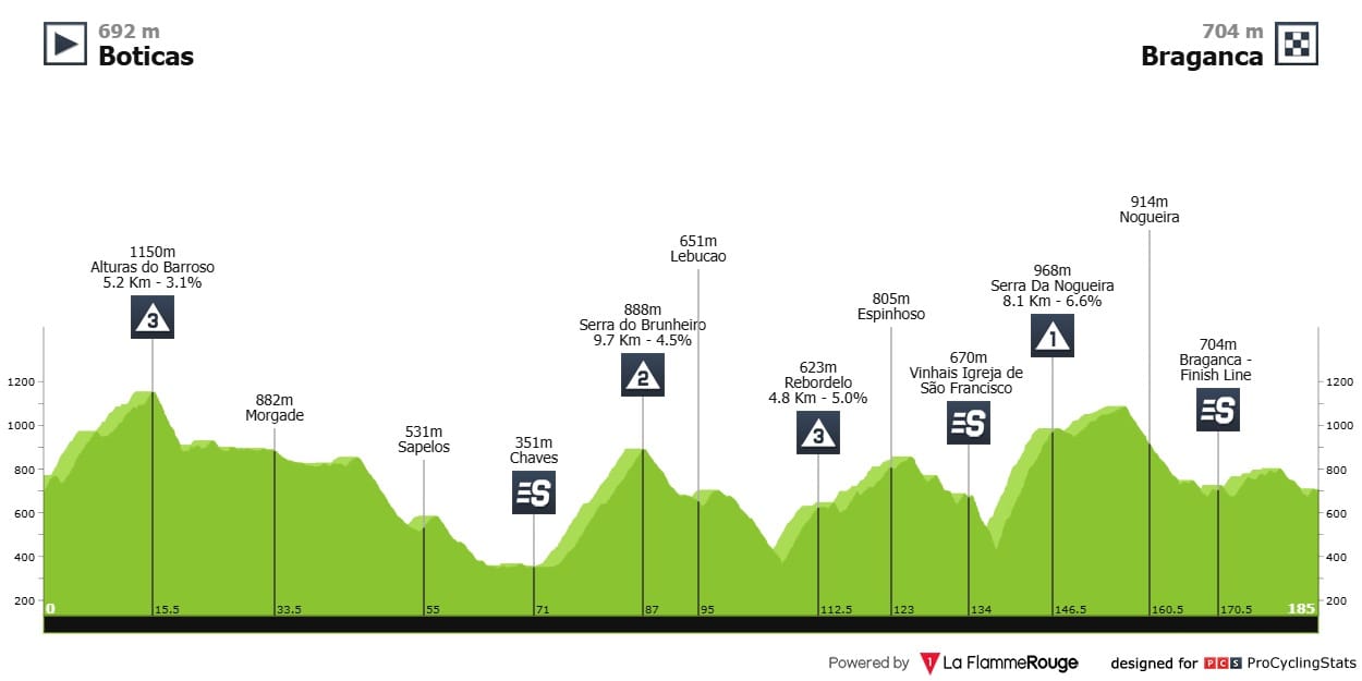 Etapa 3 — Ok, esta não acaba em subida. Mas é uma etapa de 185,2 quilómetros, onde temos quatro contagens de montanha categorizadas (fora o que sobem e não contabilizaram), com passagens na Serra do Brunheiro (9,7km a 4,5%) e Serra da Nogueira (8,1km a 6,6%) — a 40 km da meta. São, no total, 3105 metros de desnível positivo acumulado. Este país não é para sprinters.