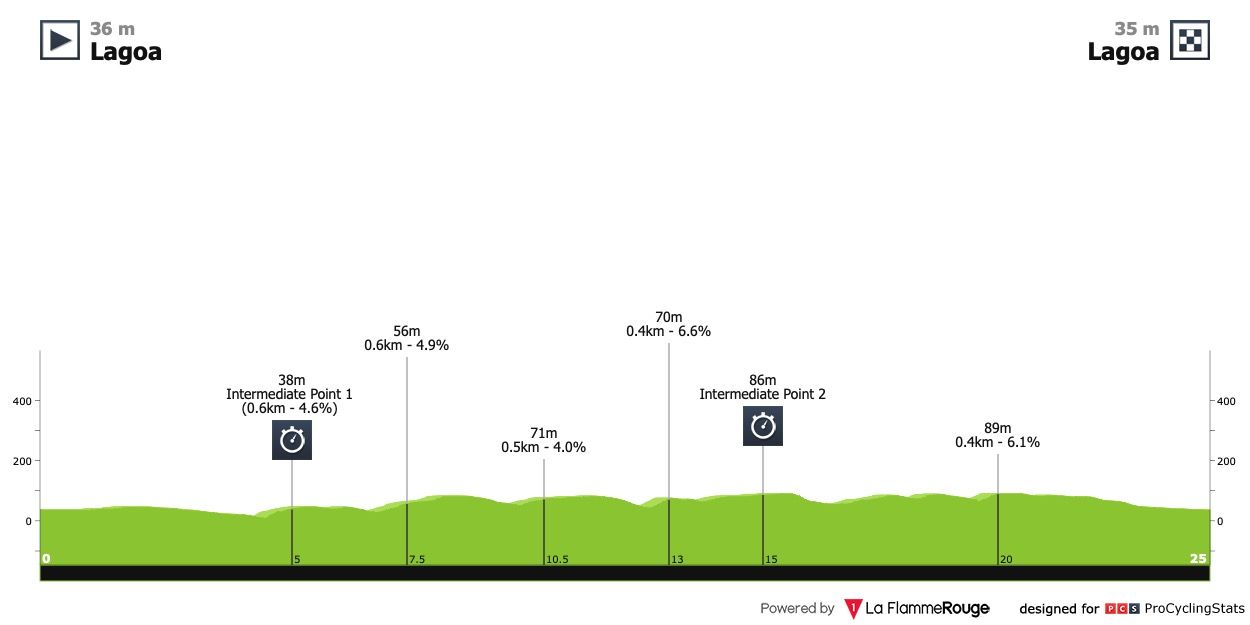Etapa 5 — Outra das características habituais da prova algarvia é providenciar um teste contra o cronómetro numa extensão já considerável para esta altura da época. Este ano volta a ser colocado no final e coroará o grande vencedor desta edição. 25 quilómetros planos na cidade de Lagoa, perfeito para os especialistas colocarem toda a sua potência na estrada.