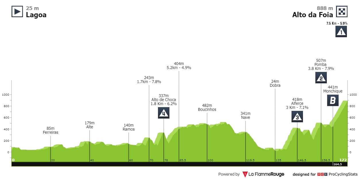 Etapa 2 — Irá ser o primeiro teste para os homens da geral. Esta etapa foi ligeiramente endurecida, a subida de Alferce (3km - 7.1%) aparece já nos 30 quilómetros finais, seguida da subida da Pomba (3.8km - 7.9%), que antecede a mítica subida final do Alto da Foia (7.5km - 5,9%).
