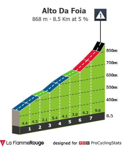 Esta ascensão está dividida em dois momentos. No primeiro, os ciclistas sobem até ao alto da Pomba (3.8km a 7.4%). E depois sim, o tão aguardado Alto da Foia (8.5km a 5%), com uma chegada final nos 9% de inclinação.