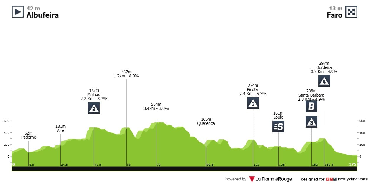 Etapa 4 — A quarta e última etapa de fundo inicia em Albufeira e passa pelo Malhão (2,2km @ 8.7%) ainda dentro dos primeiros quarenta quilómetros. Segue-se uma passagem por Picota (2.4km @ 5.3%) ligeiramente mais dura que a da segunda etapa e rumam a Loulé. A subida a Santa Bárbara (2.8km @ 4.9%) já dentro dos quarenta quilómetros finais terá bonificações e será depois do topo no Vale da Bordeira (0.7km @ 4.9%) que os ciclistas irão preparar a chegada a Faro.