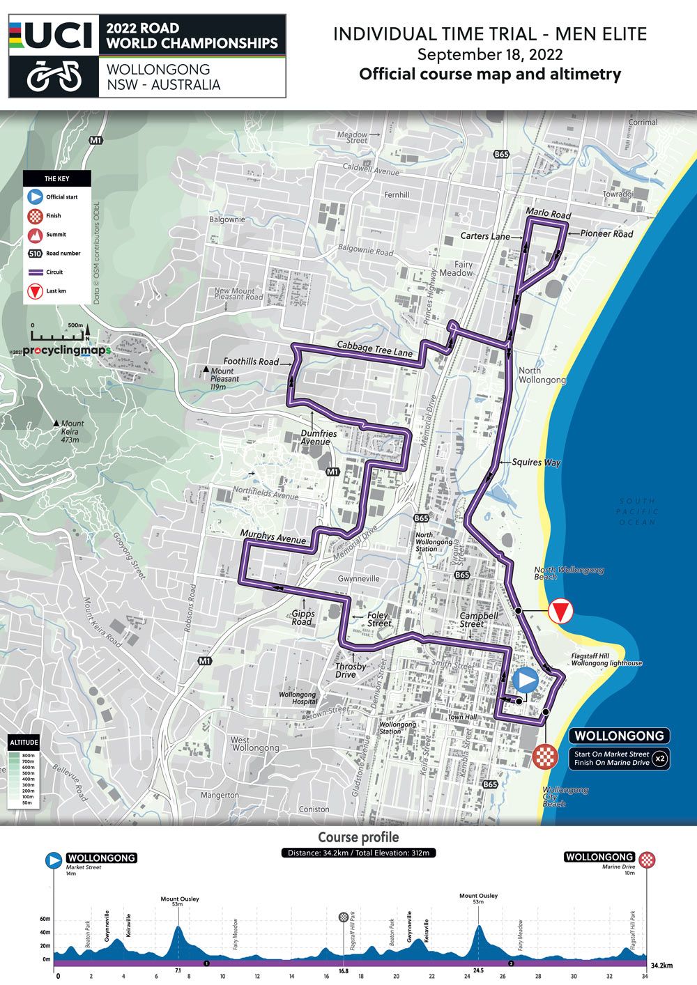 O percurso, que se inicia na Market Street e termina na Marine Drive, consiste em duas voltas pela cidade de australiana de Wollongong, com um total de 34.2 quilómetros de distância e 312 metros de acumulado.