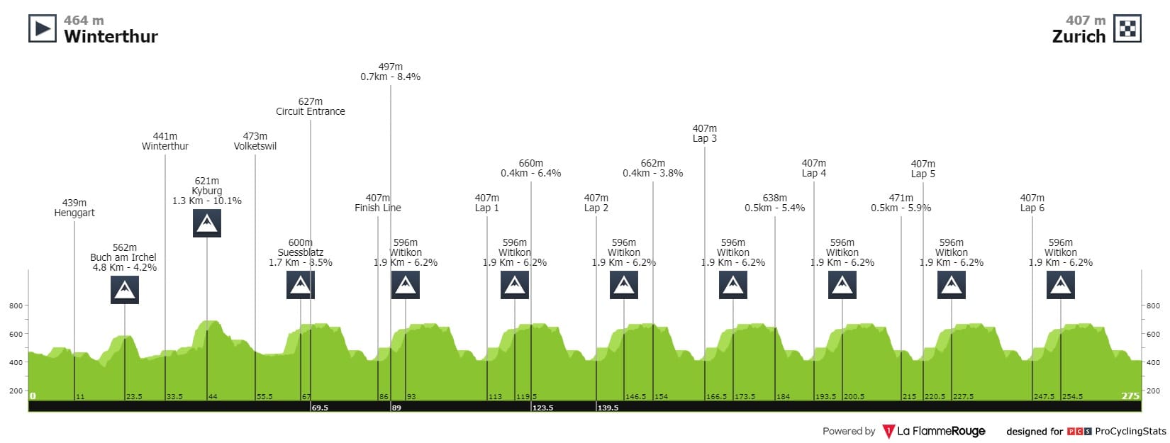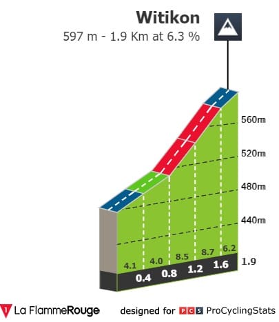 As três grandes dificuldades do percurso são Kyburg (1.3km a 10.2%), Suessblatz (1.7km a 8.7%) e Witikon (1.9km a 6.3%).