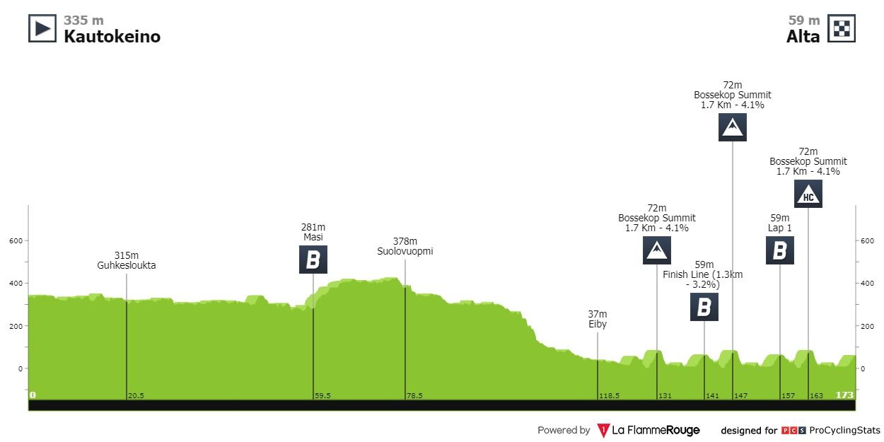 - Etapa 1 — Granfondo de 120km desde Kautokeino até Alta, e depois começa a ação com quatro voltas a um circuito que termina com a subida ao Bossekop Summit (1.7km @ 4.1%). O primeiro a passar lá quatro vezes, ganha. Não descarto a vitória de um sprinter. Espera lá... há sprinters?