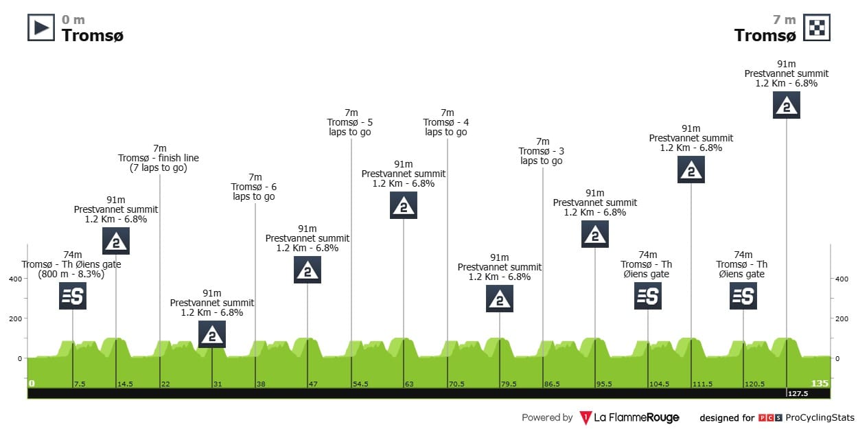 Etapa 4 — Mas nem tudo fica decidido na terceira etapa. Circuito com alguma dureza no último dia, em torno da bela Tromsø, a maior e mais importante cidade da zona Norte da Noruega. Dois muritos complicados que são passados oito vezes. Teste de percurso para um mundial a Norte depois de Kristoff não ter conseguido vencer Sagan em Bergen 2017?