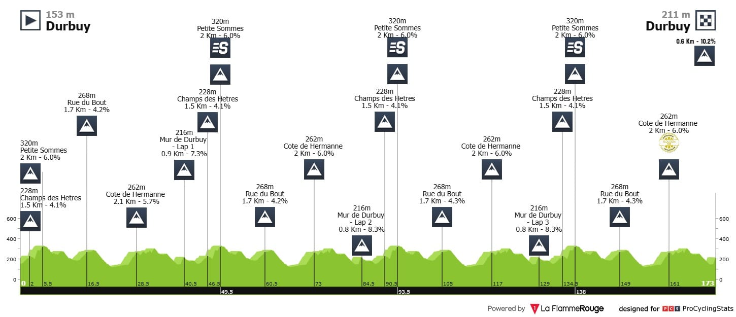 É um circuito na cidade de Durbuy com dois mil novecentos e trinta e um metros de acumulado e com quatro passagens pelo Mur de Durbuy, uma delas a coincidir com a meta, e muro esse que chega a ter pendentes a rondar os doze por cento.