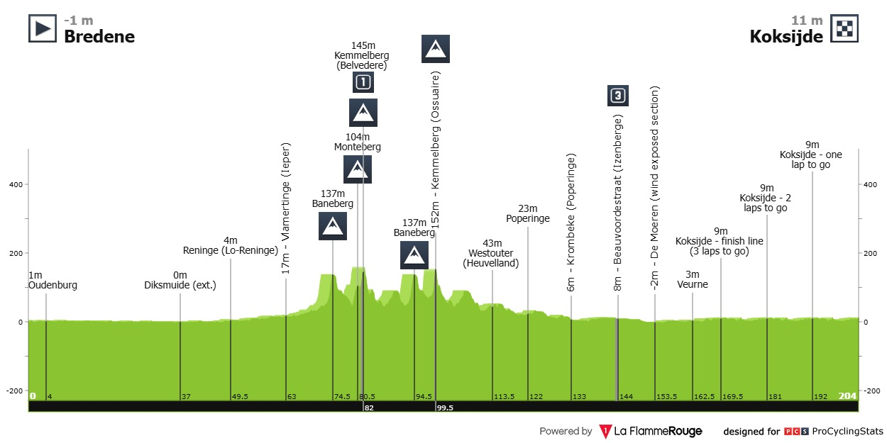 Análise ao percurso: Como o O Primož do Roglič escreveu em 20 de Março de 2025: "Cerca de duzentos quilómetros em que o mais certo é acabar em sprint de pelotão compacto. O Kemmelberg são 700 metros a 10.3%, mas a segunda e última passagem é feita a 100 quilómetros da meta. Tempo mais do que suficiente para as equipas dos homens mais rápidos se organizarem e anularem qualquer tipo de tentativa de fuga utópica.". É isto. Não muda nada que possa influenciar a corrida, apenas colocaram mais três quilómetros, deve ser para passar na porta de um patrocinador.