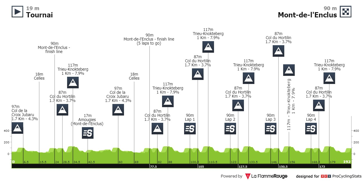 Análise ao percurso: O típico terreno acidentado da Bélgica. Subidas curtas e explosivas em que se destaca a última, o Trieu-Knokteberg, 1km a 7.9%, onde provavelmente acontecerão os derradeiros ataques.