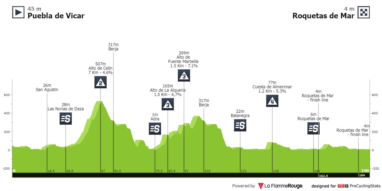 Um percurso inicialmente algo acidentado com quatro subidas, uma de quarta categoria, duas de terceira e uma de segunda, em que destaco o Alto de Fuente Marbella, 1.5km a 7.1%.